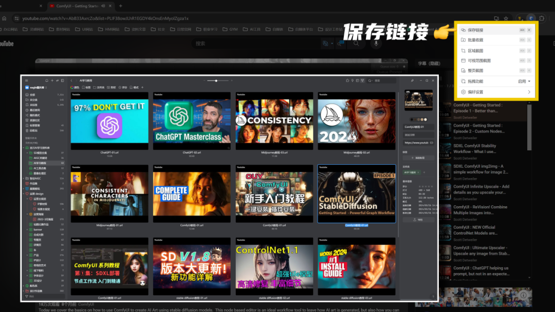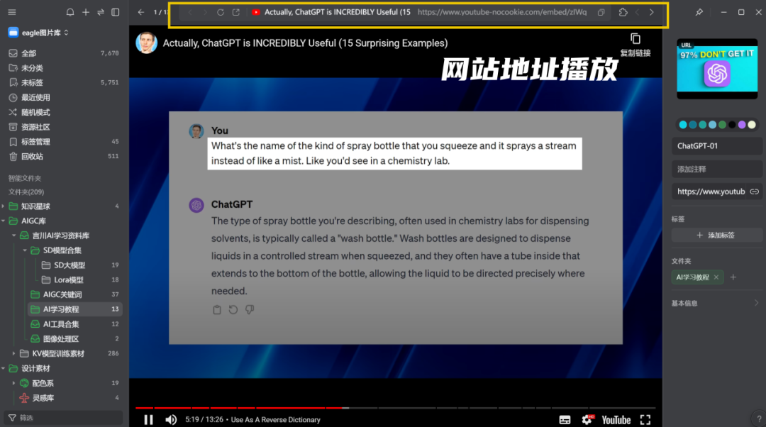 我们在用浏览器看视频时,如果觉得这个视频很喜欢,想收藏起来,我们也只需要点击Eagle插件,就可以把该网站保存在Eagle中,下次查看时只需要打开Eagle即可,我就是通过这个功能来保存我的AI学习教程的。