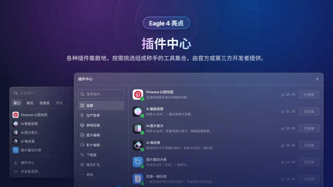 Eagle 4.0版本新增多项插件功能,包括AI自动去背景、AI图片放大、图像一键压缩、图片裁剪等多种实用工具。