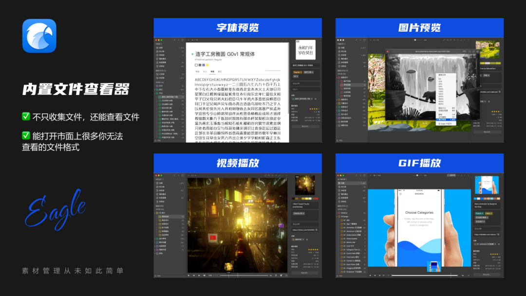 它不只是能收集文件,还能查看文件,比如字体预览、视频播放、GIF播放器、图像预览、音频播放等,市面上很多你无法查看的文件格式,他基本上都能通过Eagle打开它。