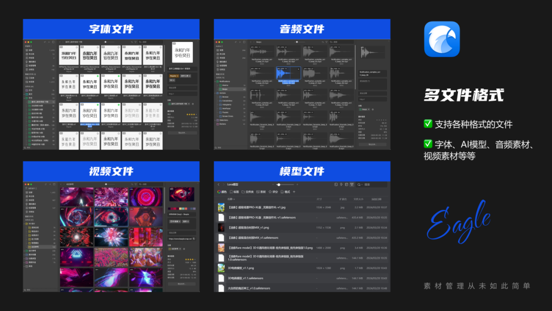 除了各种图片的管理,Eagle还支持各种格式的文件,比如字体、AI模型、音频素材、视频素材等等,任何我们工作做会遇到的文件,你都可以用它来整理。