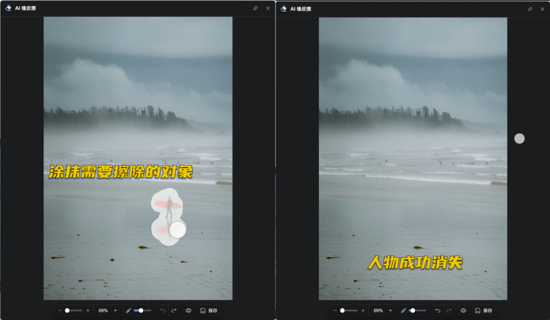 圈选图片中不需要的物件,利用 AI技术一键去除。如图所示,在出去游玩拍摄的照片,如果有人物影响了风景照,就可以使用这个插件一键擦除,非常实用!