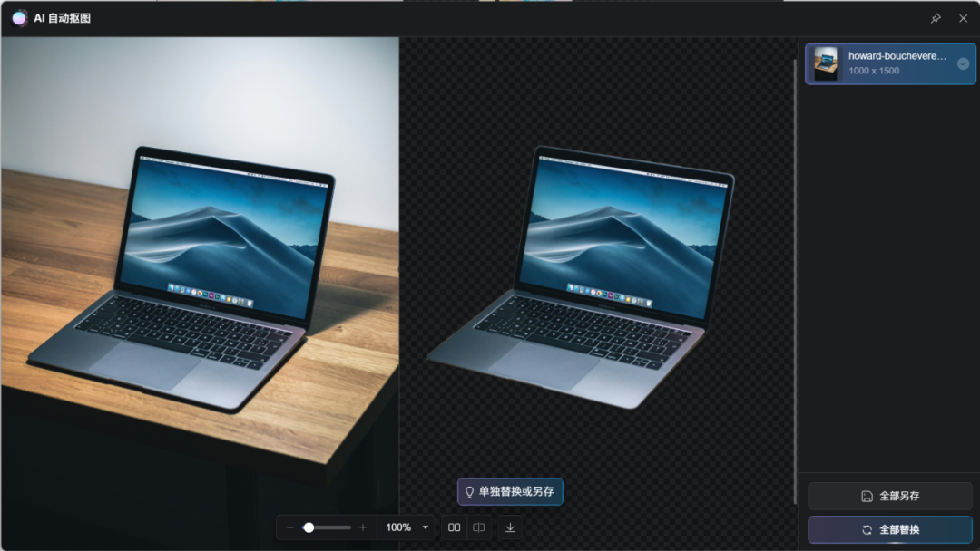 使用AI技术自动识别图像主要物体并精确去除背景,支持批量处理功能提升处理效率。
