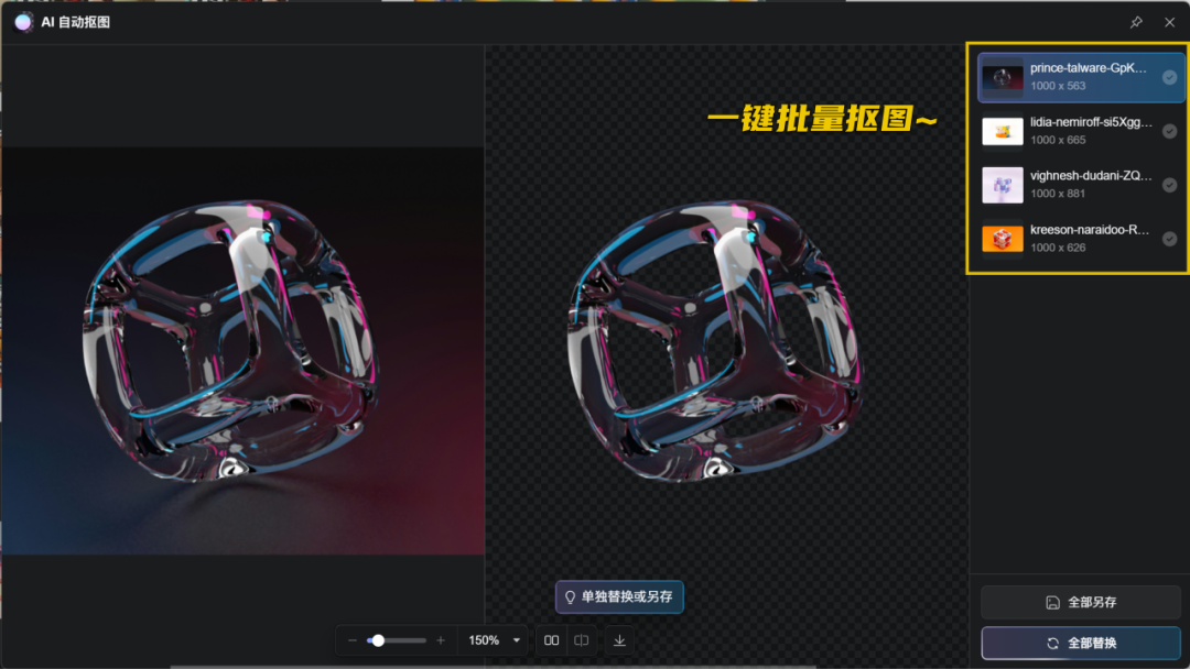 并且还支持一键批量抠图,抠图速度也非常快,很方便。同样我们在MJ中生成3D元素之后,可以利用这个功能帮我们快速抠图,效率拉满了。