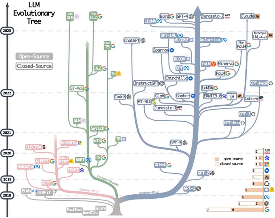 大模型和传统 NLP 技术从算力消耗和能力上,都给人非常直观的差别,所以才能火出圈。大模型的定义又是什么呢?维基百科词条[2]对它的定义是,神经网络中的参数超过十亿的深度学习模型。所有的大模型都其实来源于 Google 在 2017 年发表的 Transformer 论文,我们这里暂时认为所有基于 Transformer 的都是大模型,下图是网上很火的大模型发展树来源[3]: