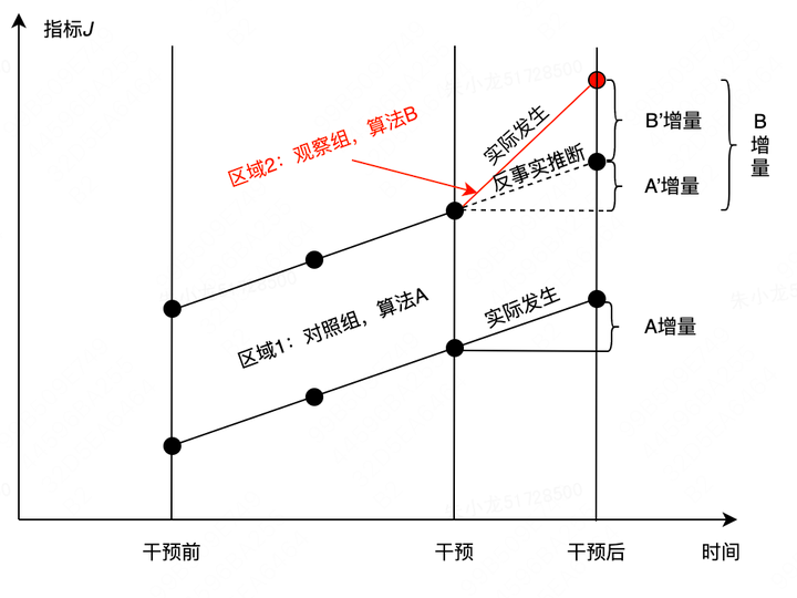 - 双重差分:在一些情况下,我们无法进行实验,例如在某些业务项目中,实施变更可能影响整个系统或用户群体,难以进行分组实验。在这种情况下,可以采用双重差异的方法进行度量。双重差异是指通过比较实施变更前后的差异,以及与未实施变更的对照组的差异,来评估变更的效果。通过对比两个差异,我们可以初步推断变更对结果的影响,并进行相对比较。