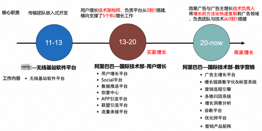 我于2011年研究生毕业入职第一家公司,在公司的杭研所从事无线基本软平台的嵌入式开发工作,我们部门是做基础软件平台开发,向上支撑不同的无线产品(2G、3G、4G基站产品),这阶段积累了一定的平台化设计能力。13年加入阿里,参与并负责了用户增长平台从0到1的搭建工作,这阶段我们对接了很多外部的流量媒体,在团队的努力下,alibaba的流量规模涨了3倍,同时询盘规模达到过历史新高,自己也从一名普通的开发人员成长为用户增长的技术架构师,负责设计很多平台横向支撑了5个BU的用户增长工作,这阶段了对用户增长的业务策略、技术打法有了较全面的理解,抽像问题能力和平台化设计能力有了比较大的提升。2020年由于数字营销业务发展的需要,听从组织安排,从待了近7年的用户增长业务调整到了数字营销部,负责了广告主增长的战役,这个阶段,将用户增长的方法论快速复制到了广告主增长领域,负责了团队与技术从0到1的搭建,广告主的月活达到了历史新高,2021年开始负责效果广告与增长业务。
