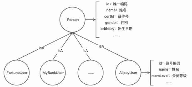 | ●不同业务部门构建图谱时先专注于自身领域的知识建模,但随着业务的开展,需要引入其他领域的知识。 ●跨图谱融合,解决提高数据的复用性、提升数据治理能力,减少数据冗余重复及帮助发掘业务价值拓展。 ●需要对领域内有共有的实体,如:用户、商家、POI等,提供统一的schema规范,并对域内常识或公用类目,如:行政区划、mcc类目等,沉淀为通用语义资产。 |