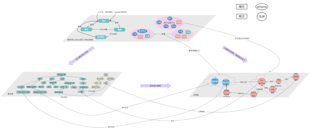 3.在实例层,首模式层的约束,对非结构化文本做信息抽取,对于结构化的信息,也受概念层的语义约束,标准化、语义化为规范的属性值表示,以建立实体-实体、实体-概念间的语义关联。在实例知识标准化、结构化到图谱后,受模式层的语义规则、事理关系、业务逻辑的约束,对知识进一步挖掘和推理。