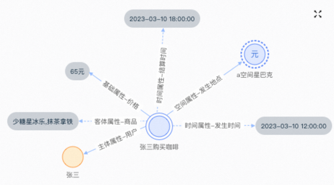 • 多元时空知识可包含多元时空事件实体以及多元时空概念事件。多元时空事件实体对应于客观存在的多元知识,而多元时空概念事件是对客观存在的具有共性的多元知识的抽象。以用户行为为例,“张三下午3点在星巴克购买了一杯咖啡”这是一个多元事件实体,“年轻白领在工作日的下午点咖啡”这是一个概念事件,是基于大量的相似的实体多元知识抽象而来。事件实例的至少一个论元对应客观存在的事物,如行为主体对应具体的某个人,而如图18,概念事件的论元均对应抽象知识。