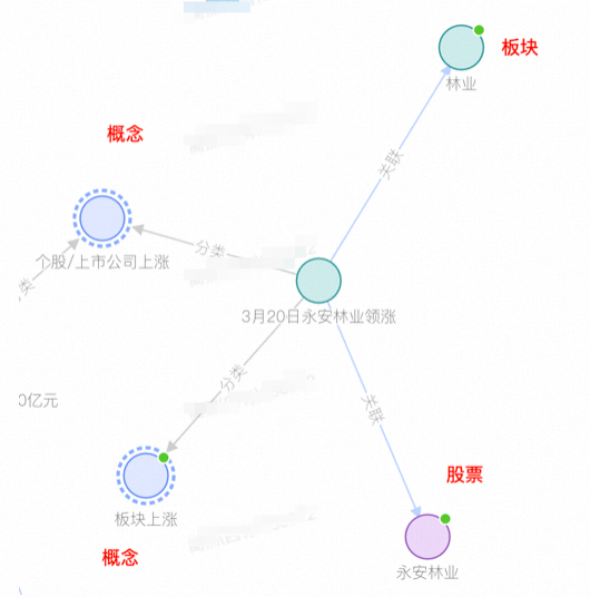• 多值链指能力:在确定的属性上(如“个股/上市公司上涨”的“关联”属性,“用户消费行为”的“商品”属性)绑定链指算子,并在算子的实现逻辑中,支持对多类型值的链指。例如,对于“3月20日永安林业领涨”,结构化抽取结果中包括:{关联: 林业@板块, 永安林业@股票},则事件节点本身通过链指拉边,关联到属性值对应的实体对象、概念节点上。