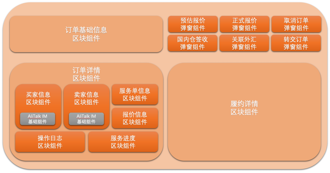 • 区块组件:业务知识较重的大组件。它内聚了很多业务知识,通用性弱,甚至可以没有通用性,强调业务的内聚性。