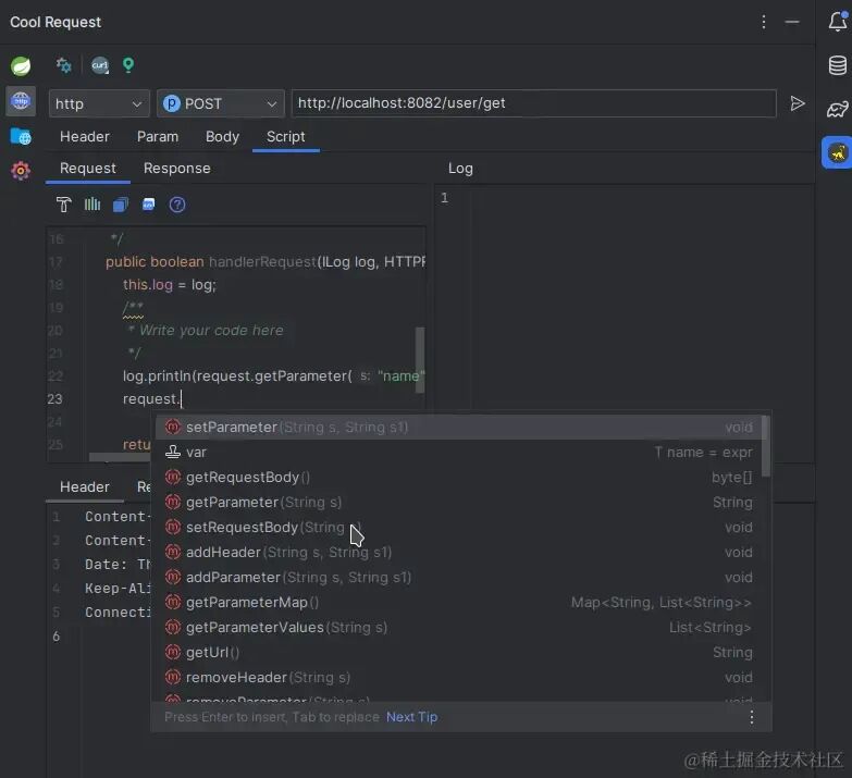 最方便的莫过于Cool Request提供了java的前后置脚本了,也算不上脚本了,习惯这么叫,而其他插件要不就是没有,要不就是提供的JS脚本,对不熟悉JS的人来说,增加了学习成本,而Cool Request就非常方便了,另外在编写代码时,是有语法提示的,例如在脚本中修改参数的api,也不需要过多的学习,几乎是0成本。在handlerRequest方法中,有两个参数,第一个是日志输出接口,可以使用他的println方法输出日志,会在右面的log窗口看到,第二个参数是HTTPRequest,他有一系列方法,使用.号时候就有提示,所有的方法我们一眼就能看出是做什么的。