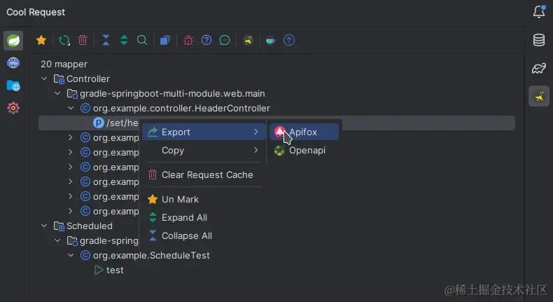 如果团队使用了apifox,它还可以支持导出到apifox里面,虽然apifox自己也有插件,但是apifox不提供目录选择,而Cool Request支持,当然需要配置apifox的一些token,这点可以在插件的官网找到详细的说明。