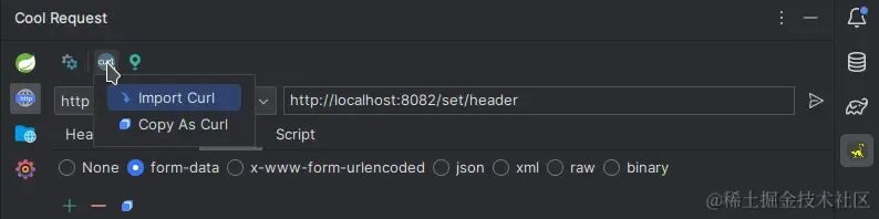 如果有一个cURL参数(可能是从浏览器中复制过来的),那么可以快速导入的Cool Request里面,同时也支持将请求复制为cURL格式。