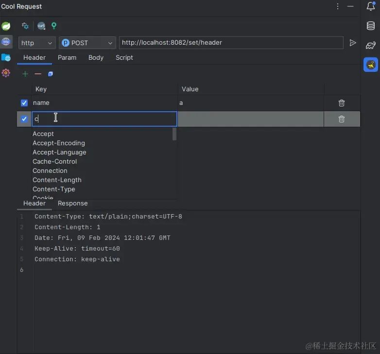 当双击某个Controller时候,会跳转到请求发送界面,在这里可以填写参数,Cool Request和同类的插件相比,在填写Header时候,也是有提示的,而其他没有,这一点非常方便。