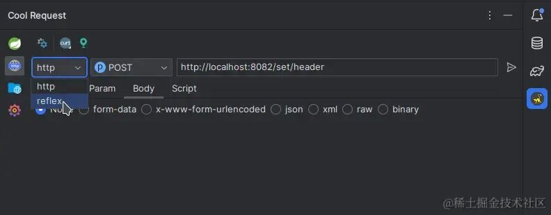 使用方式是在请求界面选择reflex,然后填写参数后发起请求。