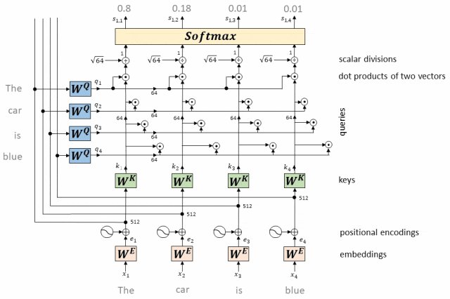 (3)使用Softmax函数对这些相似度分数进行归一化,生成一个权重分布,该分布表示了在计算当前位置(query)的表示时,应赋予其他位置(keys)多大的关注程度。