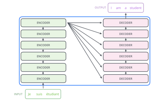 Encoder-Decoder(编码器-解码器):左边是N个编码器,右边是N个解码器,Transformer中的N为6。
