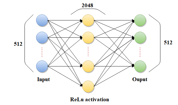 前馈神经网络(FFNN)的表达式为:FFN(x) = max(0, xW1 + b1)W2 + b2