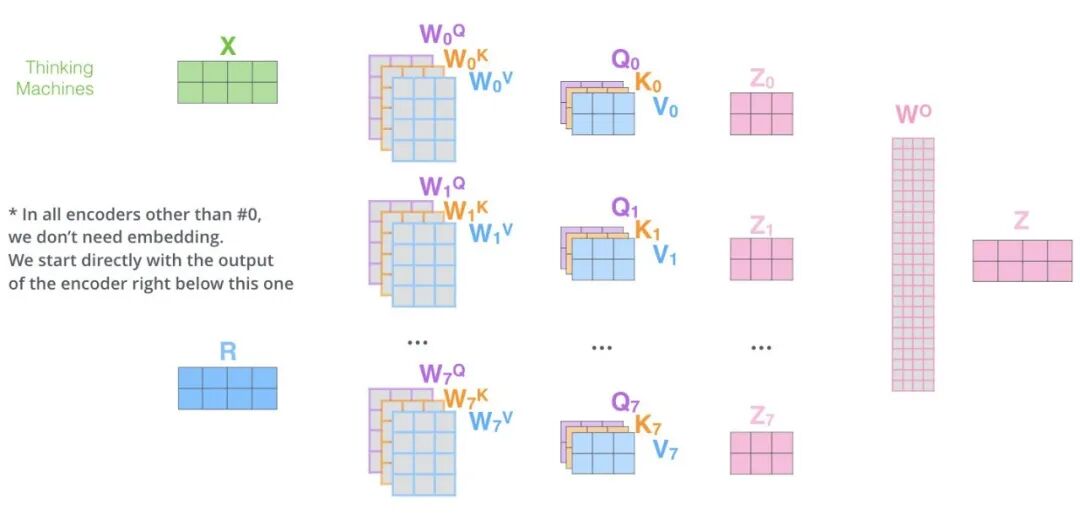 - 对于“我”这个词,其512维嵌入向量被相应地拆分成8个64维的子向量。