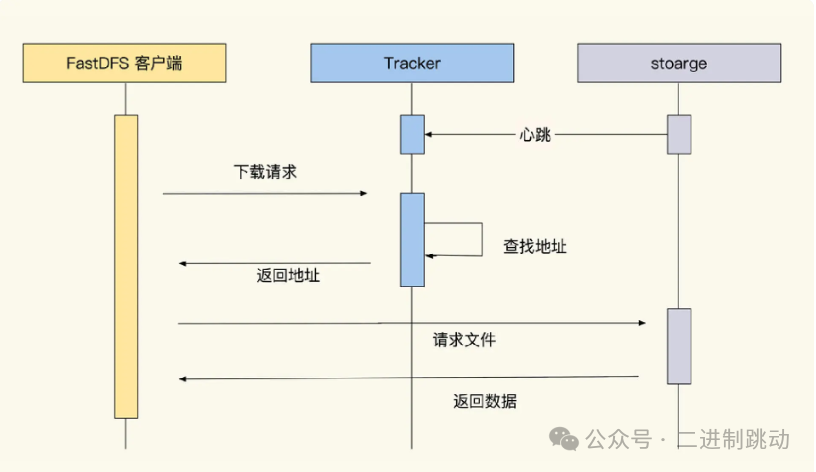 为了帮助你理解常见的分布式存储服务的工作原理,我们将以 FastDFS 分布式存储为例进行分析,请看下图: