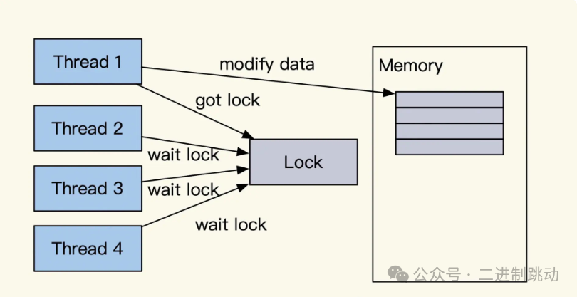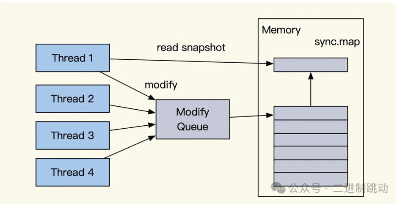 除此之外还有一种方式,就是将我们的修改、读取等变动只通过一个线程去执行,这样能够减少锁冲突加强执行效率,我们常用的 Redis 就是使用类似的方式去实现的,如下图所示: