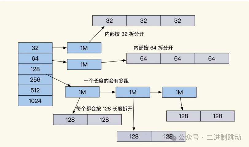 我来举个例子,在 Redis 里可以选择用 jmalloc 来减少内存碎片,下面我们一起来看看 jmalloc 的实现原理。jmalloc 会一次性申请一大块儿内存,然后将其拆分成多个组。为了能够适应我们的内存使用需求,它会把每组切分为相同的 chunk size(块大小),而且每组的大小会逐渐递增。比如第一组都是 32byte,第二组都是 64byte。