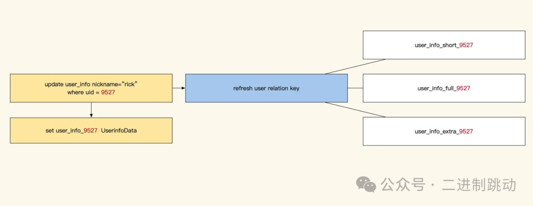 单条实体数据缓存更新是最简单的一个方式,比如我们缓存了 9527 这个用户的 info 信息,当我们对这条数据做了修改,我们就可以在数据更新时同步更新对应的数据缓存: