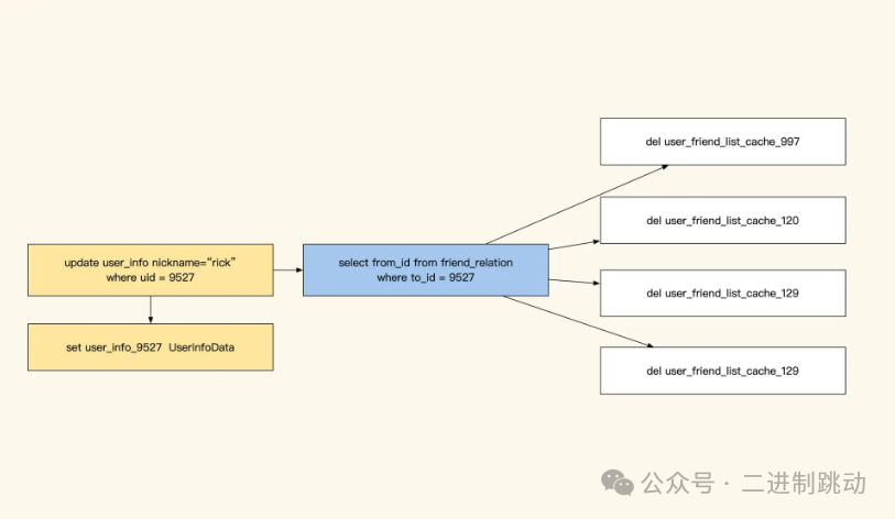 除了这种方法,我们还可以向队列发送更新消息,让子系统处理更新,或者开发中间件,将数据操作发送到子系统,让其自行决定需要更新的数据范围。然而,通过队列更新消息时,我们可能会遇到一个问题——条件批量更新时,可能无法直接确定具体有多少个 ID 发生了变化。常见的解决方法是:首先按照相同的条件查询出所有受影响的 ID,然后执行更新操作,最后使用这些相关的 ID 更新具体的缓存。