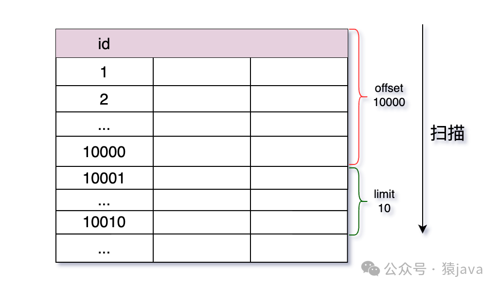 在这种情况下,MySQL 必须扫描 10010 行,即使只返回 10 行。这种扫描和丢弃操作会导致大量的 I/O 操作,特别是在表数据量很大的情况下。