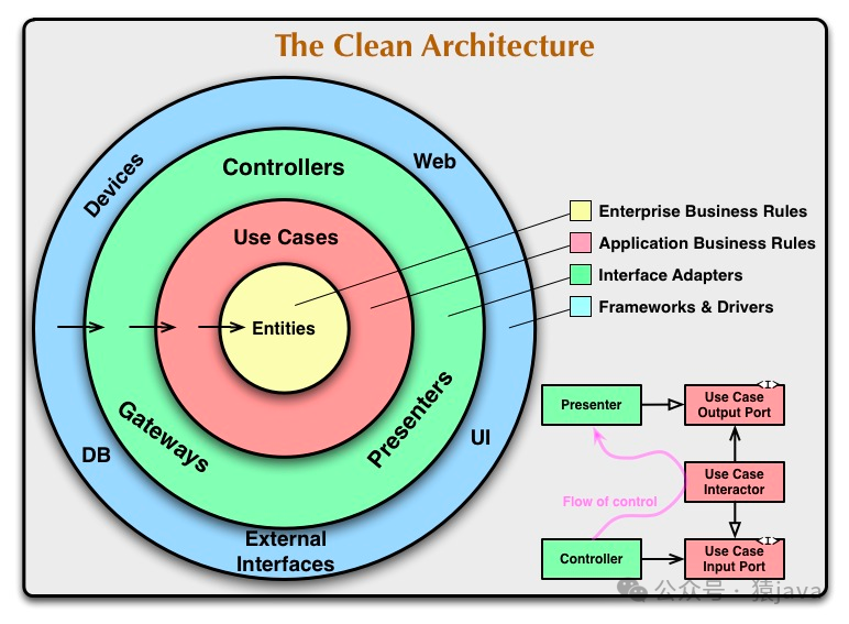 从整洁架构的架构图可以看出:整洁架构最主要的原则是依赖原则,它定义了各个层级的依赖关系,同心圆代表软件的不同领域,越往里能力越是核心。外圆代码依赖只能指向内圆,内圆无需关注外圆变化(包括函数、类。变量,或任何其他命名的软件实体)。