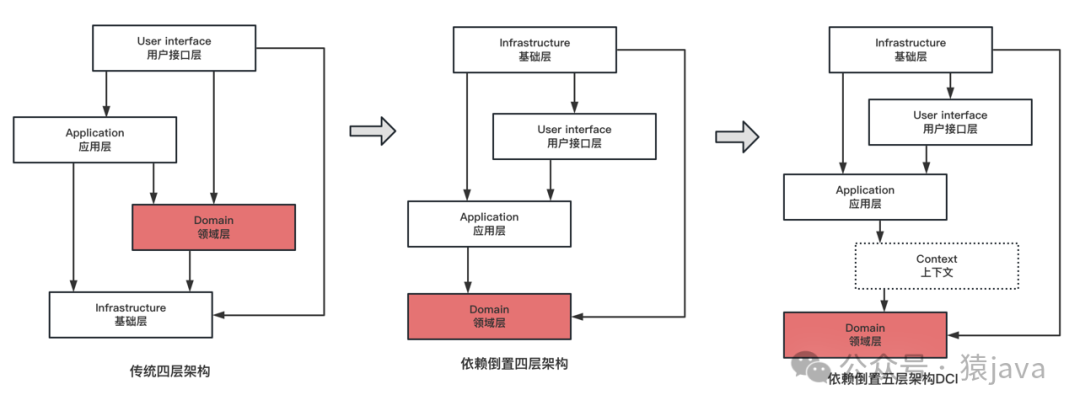 DDD 分层架构应该是目前流行度最高的一种架构方式,但是,其架构也经历了多次的变更。DDD 最早使用的是传统的四层架构;后来四层架构发生了优化,实现了各层对基础层的解耦;再后来领域层和应用层之间增加了上下文环境(Context)层,五层架构(DCI)就此形成了。架构演变图如下: