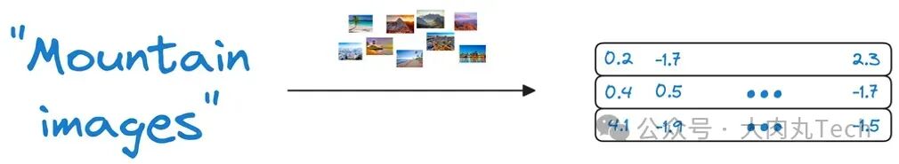 现在,当我们想要查找相似的照片时,比如,我们想找到山脉相关的图片,这时候我们输入“Mountain images”,输入的文本会被编码为文本向量,并在向量数据库中匹配最接近该文本向量的图片向量,最后再根据这些图片向量反查找到图片。