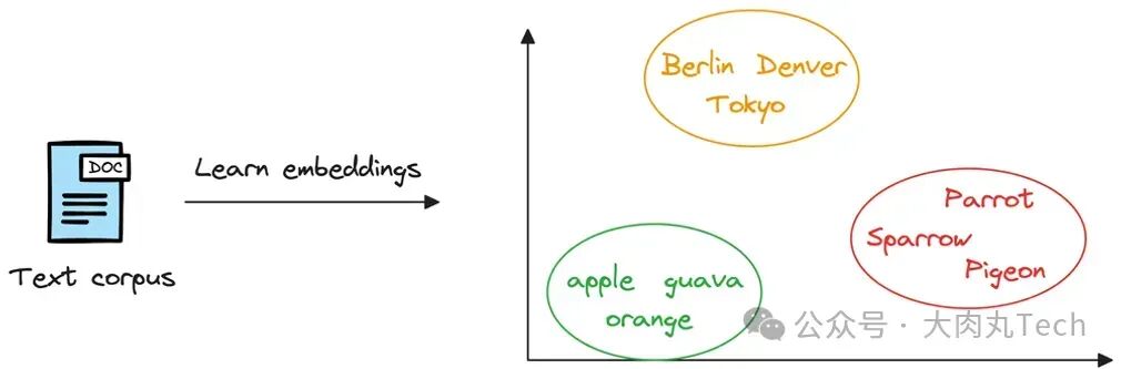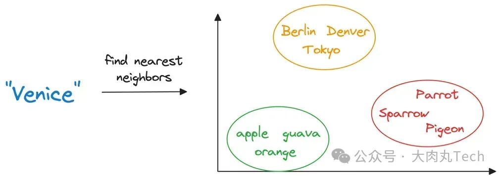 例如下图,考虑到词嵌入,我们可能会发现在嵌入空间中,水果因为彼此的嵌入接近,从而会形成一个集群(因为嵌入是数字向量,所以可以利用一些算法判断是否相近),而城市又会形成另一个集群等。