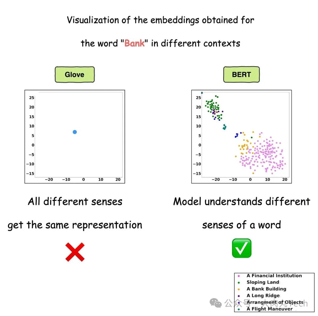 如上图所述,静态嵌入模型 Glove 和 Word2Vec 为 Bank 这个单词生成了相同的嵌入(尽管它有不同含义)。
