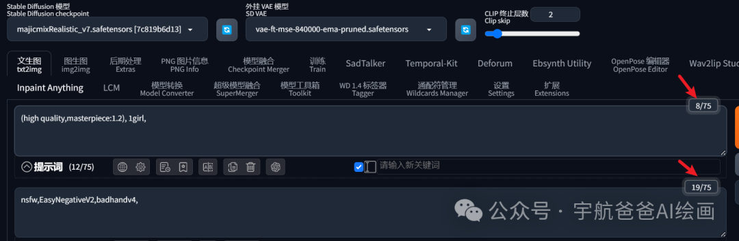 提示词右上解格式为:当前单词数量/总单词数量;总单词数量并不是固定的,可以自动扩充长度。但按照最佳实战,提示词单词最好不要超过75个单词,太长的提示词,后面的提示词几乎不起作用。