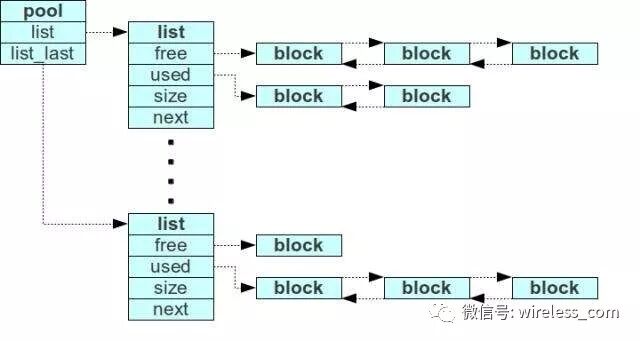 内存池, 是使用池来进行内存管理, 使动态内存分配时达到 malloc 或者 new 的效果。由于内存碎片的存在,一个有效的方案是预先分配一些内存大小相同的内存块,许多实时操作系统都适用了内存池。一种简单的内存池实现如下图所示: