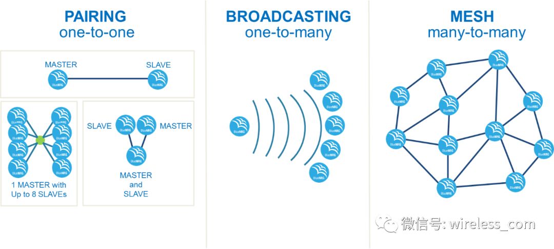 低耗电蓝牙技术于2010年在蓝牙核心规范4.0中引入。 与之前的蓝牙标准相比, BLE 被设计成用于控制和监控应用程序的低功耗解决方案。 它从诺基亚以前的无线协议中继承了这个概念, 该协议被定义成一个为个人区域网络(PAN)提供通用无线连接的解决方案, 即将个人设备连接到手机上。 这是一个典型的星状拓扑网络示例, 其中包含一个单一的中心枢纽元素; 手机充当了网络的主人, 与一个或多个从设备相连接。 这是一个一对多的连接, 提供了一个较低功耗的无线连接, 以便与本地个人设备进行短程互动。