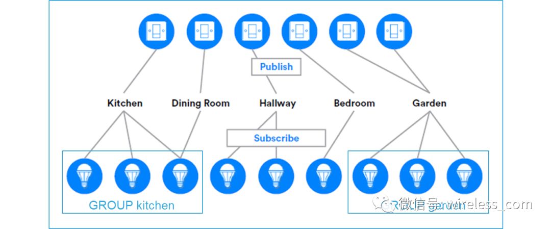 为了增加更多的灵活性, 蓝牙网格提供了定义和处理一组节点的可能性(使用组址而不是单播地址)。 这个功能可以方便地控制属于一个普通物理位置的所有灯泡, 例如房间里的所有灯泡或家庭入口。