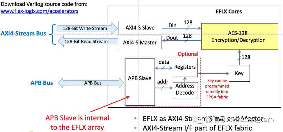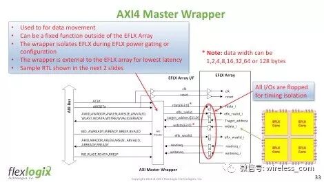 当 eFPGA 作为 AXI master 实现时, eFPGA 应该被用来简化关闭, 时间, 输入和输出。 数据总线宽度可以是1,2, 或4字节等, 最多可达128字节。