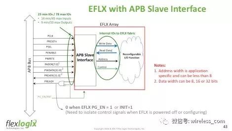 例如, 对于基于 ARM 架构的芯片设计者来说, eFPGA可以与 APB、 AHB 或 AXI 处理器总线相连, 以利用这些优势。 然而, 考虑到大量的组合(主 / 从 AXI/AHB/APB外部接口逻辑或/与 eFPGA 实现的组合), 这些设计需要仔细考虑。
