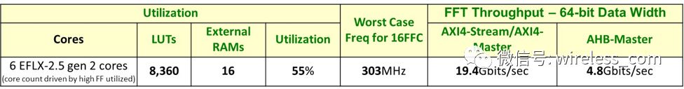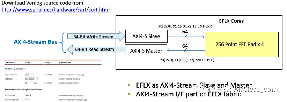 下例是FPGA 配置为256点的 FFT 加速器, 作为 axi4流总线上的一个从属 / 主控, 在 EFLX 阵列中实现 AXI RTL。