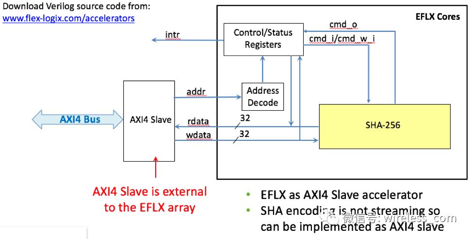 除了作为加速器或I/O处理器的阵列操作总线连接之外, 像 EFLX 这样的 eFPGA还提供了单独的从接口, 用于按照需要重新配置。 一个外部的 AXI 从封装器也可以用来与配置端口的接口。