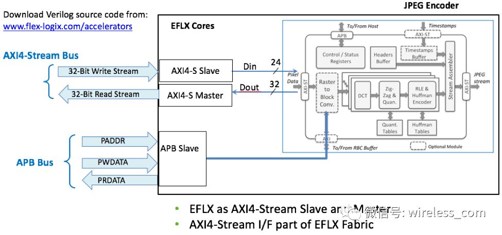 下面是一个配置为 JPEG 编码器的 FPGA 框图。 在这个例子中, axi4流和 APB 接口逻辑在FPGA 中得到了实现, 但是这个 RTL 可以很容易的放在外面, 并且是硬连接的, 因为它不需要重新配置。