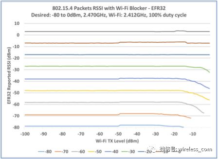 最小化 ieee802.15.4 接收到的 Wi-Fi 信号强度,可以提高802.15.4的接收范围。 例如,在100% Wi-Fi 工作周期的"远程"信道中,当 EFR32MG1输入的 Wi-Fi 能量为 -15dbm 或以下时,可以收到 -80dbm IEEE 802.15.4 信息。 如果 Wi-Fi 传输功率级别为 + 10 dBm,在 Wi-Fi 发射机与 IEEE 802.15.4之间的天线隔离距离为25 dB 或更多,RF 输入就足以总是接收 -80dbm 802.15.4信号。