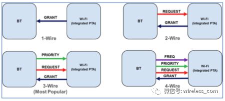 常见的 PTA 配置的一个例子是图7所示的3线配置。 在这种情况下,PRIORITY信号与REQUEST和GRANT一起使用,表示正在接收或传送高优先级或低优先级的消息。当接收请求时,Wi-Fi /PTA设备将这一外部优先级请求与内部 Wi-Fi 优先级进行比较,后者可能是高/低或高/中/低,并可选择蓝牙或 Wi-Fi (注: 优先权可以作为静态或时间共享(增强)优先级实现)。
