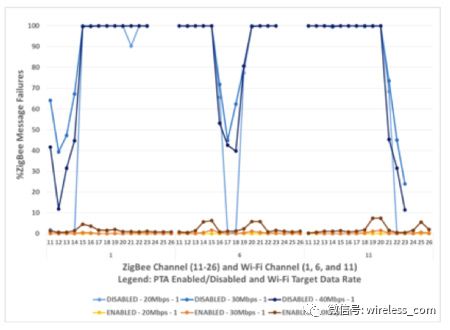 图8显示了一个由Silicon Labs进行的测试结果,并强调了 PTA 在启用时,在 Wi-Fi 存在下对 zigbee 消息失败率的正面影响。 通过重新启用 APS (如下图2所示的测试中禁用) ,消息失败会进一步减少。