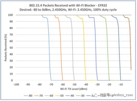 在一个真实的环境中,Wi-Fi通常不是100% 的任务周期,只有在低 Wi-Fi SNR 条件下的文件传输或视频流中才能接近100%。 在之前的三个图中,EFR32MG1设备(或EM35x/EM358x) 接收的灵敏度随着 Wi-Fi阻滞器的开关而变化。最终的结果是,当无线网络关闭时,能够获悉较弱的信号,但是当强大的 Wi-Fi 正在运行(主动传输)时就无法得到。