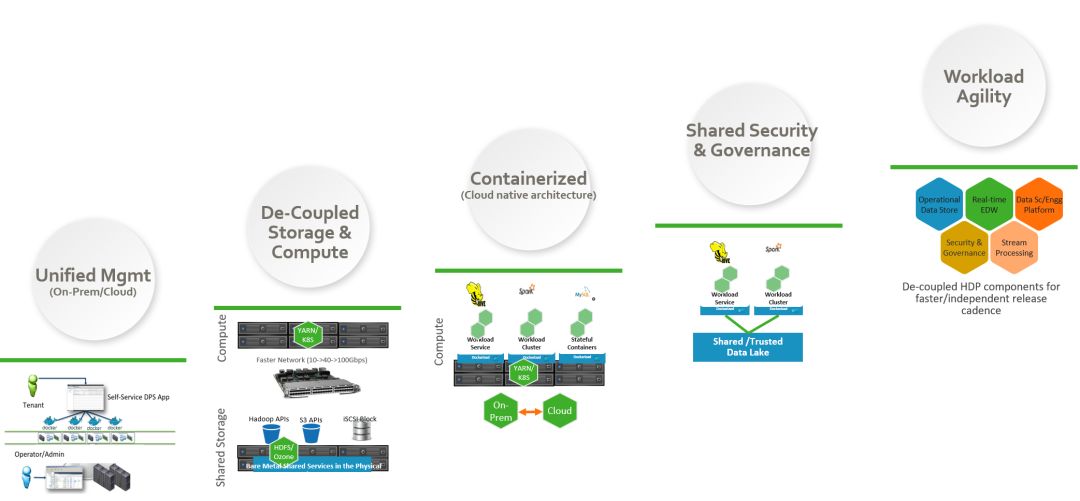 这是开放式混合体系结构的终极圣杯。 数据环境的存在,以便各种处理工作负载能够运行,从噪声中获得洞察力或信号,用户可以在他们的组织得到真正的业务转换。 许多工作负载,如 EDW,数据科学和工程平台有不同的发布节奏。这种架构能够轻松地改变独立于底层基础设施的组件的软件修改,避免一个庞大的升级,可以为大数据环境中的数以千计的租户提供一个自我服务角色为中心的用户界面来创建按需工作负载。