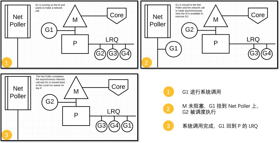 对于异步的情况,M 不会被阻塞,G 的异步请求会被“代理人” network poller 接手,G 也会被绑定到 network poller,等到系统调用结束,G 才会重新回到 P 上。M 由于没被阻塞,它因此可以继续执行 LRQ 里的其他 G。
